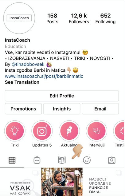 *Tuji uporabniki so ob tej spremembi v orodno vrsto dobili še zavihek "Reels". Za Slovenijo le ta ni na voljo, saj te vrste objav zaenkrat še ne moremo ustvarjati.